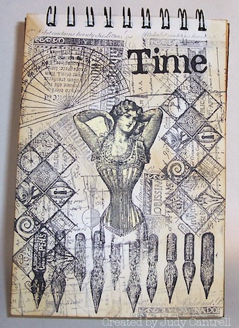 Die cut clock with chipboard, distress with ink, paint clock hands with black paint, glue clock and hands to front cover.
